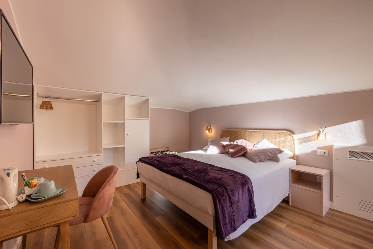 è un'ampia e confortevole double room situata al piano mansardato, composta da due camere matrimoniali indipendenti e un bagno.